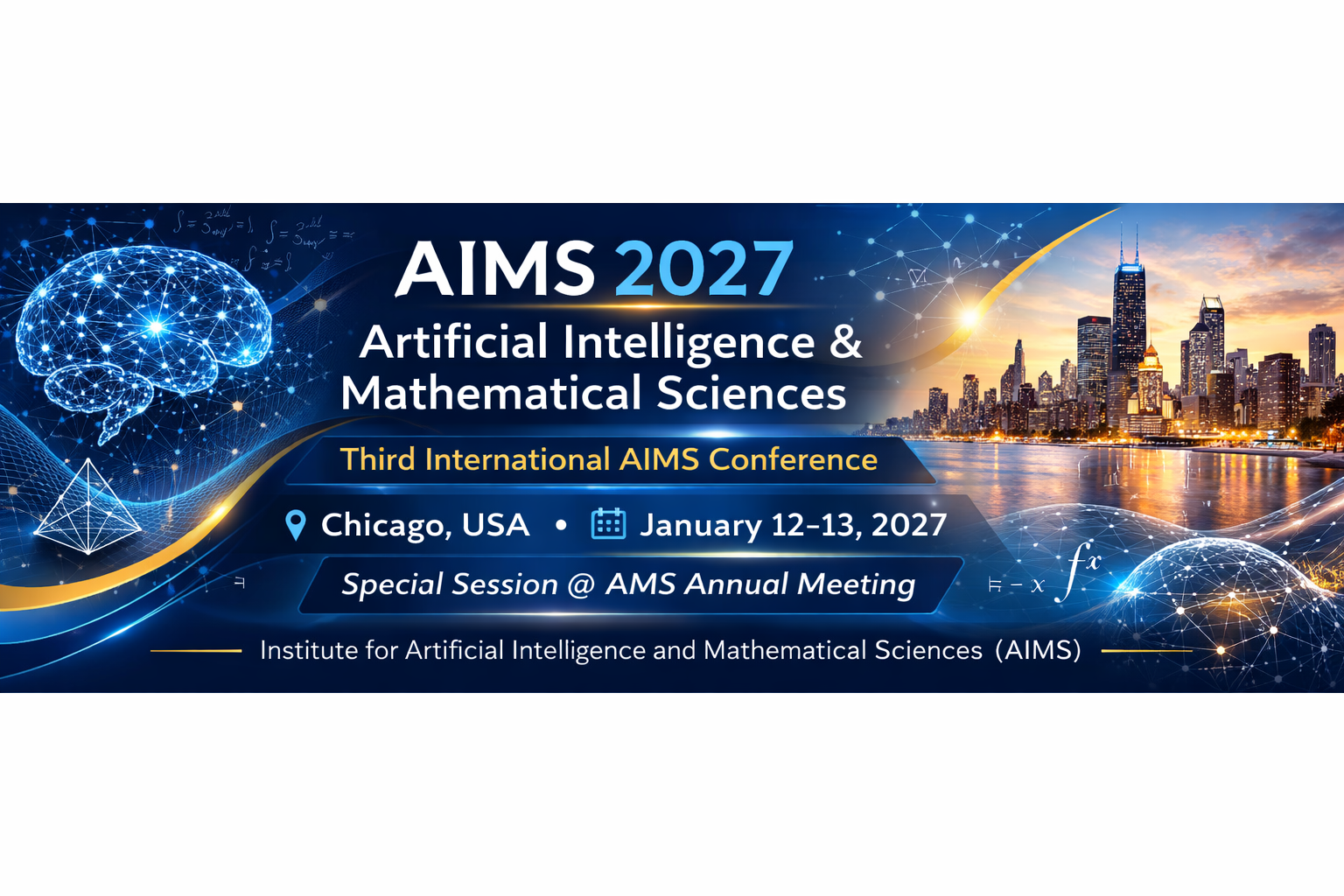 We are excited to announce the Artificial Intelligence & Mathematical Sciences (AIMS) 2027 Conference, to be held at the AMS Joint Annual Meeting in Chicago, IL. AIMS is a premier forum at the intersection of artificial intelligence (AI) and the mathematical sciences, bringing together researchers, academics, and industry professionals to explore the deep links between modern AI and core mathematical structures.